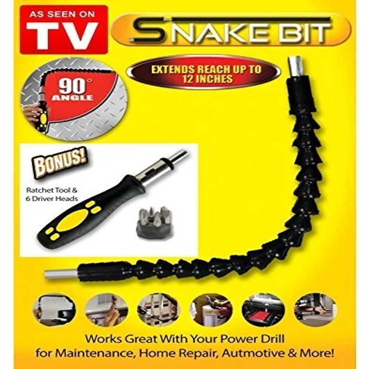 - > 100% Brand New & High Quality> Materials: High-carbon Steel> Is there a magnetic: Without magnetic> Universal shaft Dimensions: 12 inch> Handheld Screwdriver Length: 6.7 inch> Screwdriver head size: H 0.9 x D 0.3 inch> Extends reach up to 12 inches> Bends up to 90 degrees in any direction > Includes Snake Bit universal extender, ratchet tool and 6 circular driver heads
